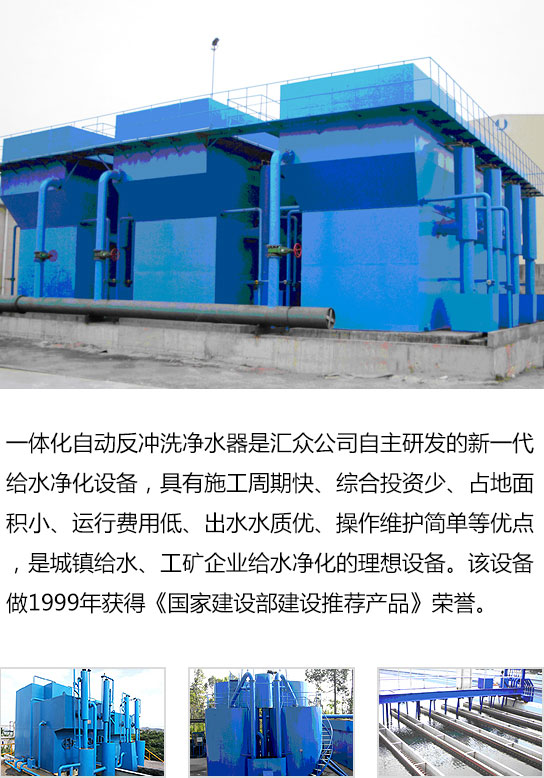 一體化自動反沖洗凈水器是匯眾公司自主研發的新一代給水凈化設備,具有施工周期快、綜合投資少、占地面積小、運行費用低、出水水質優、操作維護簡單等優點,是城鎮給水、工礦企業給水凈化的理想設備。該設備做1999年獲得《國家建設部建設推薦產品》榮譽。
