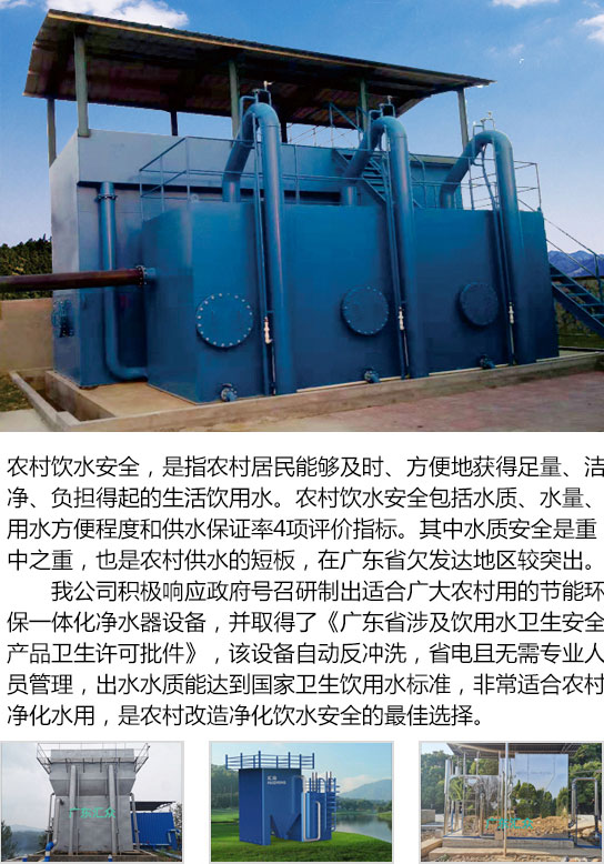 我公司積極響應政府號召研制出適合廣大農村用的節能環保一體化凈水器設備,并取得了《廣東省涉及飲用水衛生安全產品衛生許可批件》,該設備自動反沖洗,省電且無需專業人員管理,出水水質能達到國家衛生飲用水標準,非常適合農村凈化水用,是農村改造凈化飲水安全的最佳選擇。
